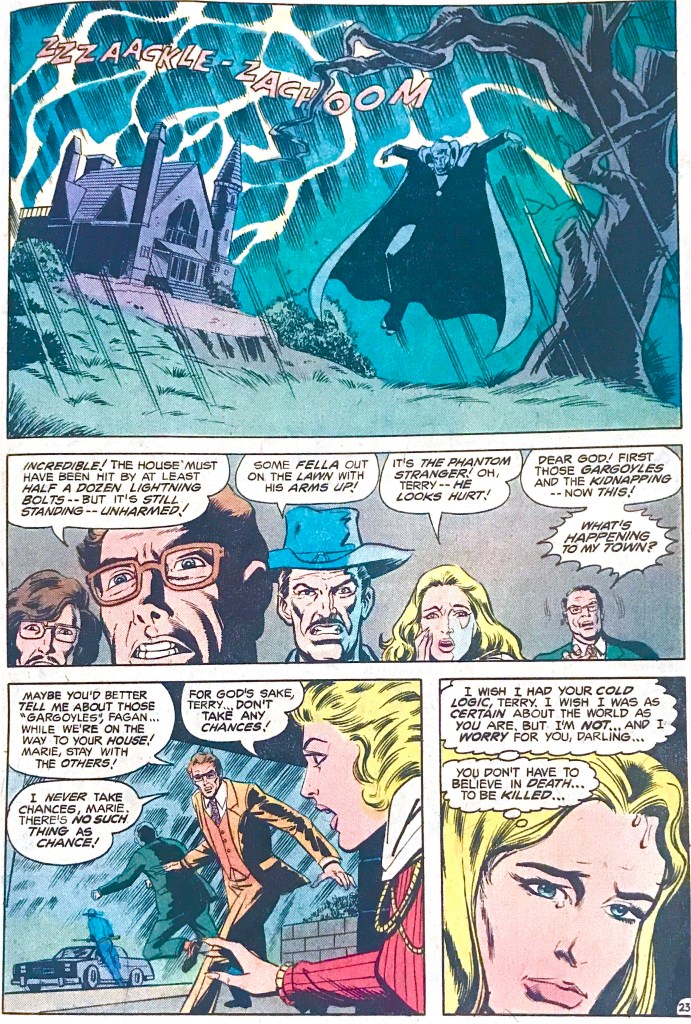 That offstage voice is the Phantom Stranger, narrator of tall tales turned active participant, here to warn Terry and Marie to stay away from Rutland, for death stalks this night etc. Of course, the self-styled Ghostbreaker isn’t having any of it, and he flounces off to a hotel with the long-suffering Marie in tow. There Terry is introduced to the aforementioned comic types by Tom Fagan, while the Stranger encounters someone even scarier.