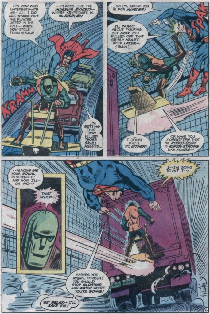 I’m guessing about Walters but there’s a definite timestamp amid the chaos of the tunnel conflict, as a lorry driver chatters away in CB radio slang. That sequence was unusual given how seldom Superman comics featured action ‘on the road’. While there’s a fair bit of unnecessary ‘tell’ in the captions, it’s an effective scene overall.