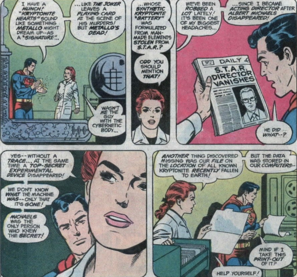 Despite being an investigative reporter in his secret ID, Superman doesn’t ask about the leather leggings when he encounters Metallo. He’s more interested in whether the bad guy is behind the implantation of fake green Kryptonite hearts into the chest cavities of dead agents of criminal organisation SKULL.