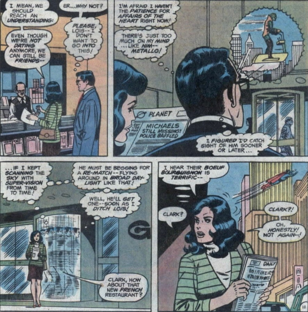 Metallo escapes yet again and a meeting Clark Kent has scheduled with WGBS boss Morgan Edge means Superman can’t pursue the glowing goon.