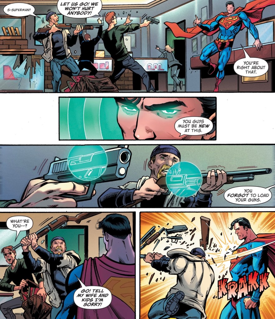 Isn’t that lovely, how Superman sits down on the pavement with the distressed woman, wanting to comfort her? There’s none of that uncharacteristic hovering above people that became a cliche in the New 52.
