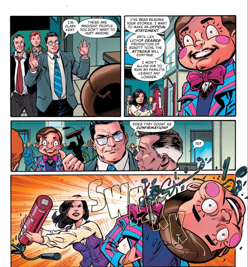 Clark Kent smells a story and seeks out Lex Luthor, who recently bought Schott Toys. Lex stonewalls Clark.