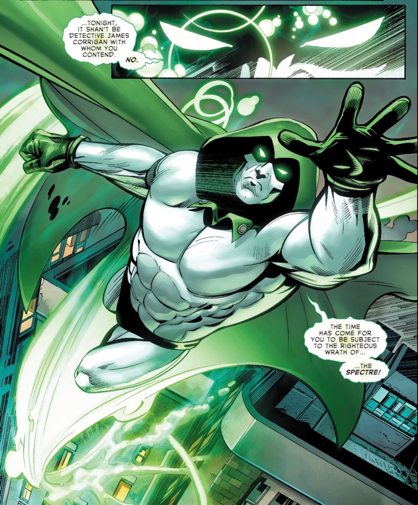 Penciller Scot Eaton and inker Wayne Faucher’s pages are great looking, with the opening showing the demise of Adrianna Brackens especially effective. And, working with colourist Hi-Fi, they present a suitably imposing Spectre, channeling the spirit of the great Jim Aparo, who drew the aforementioned oft-collected stories.
