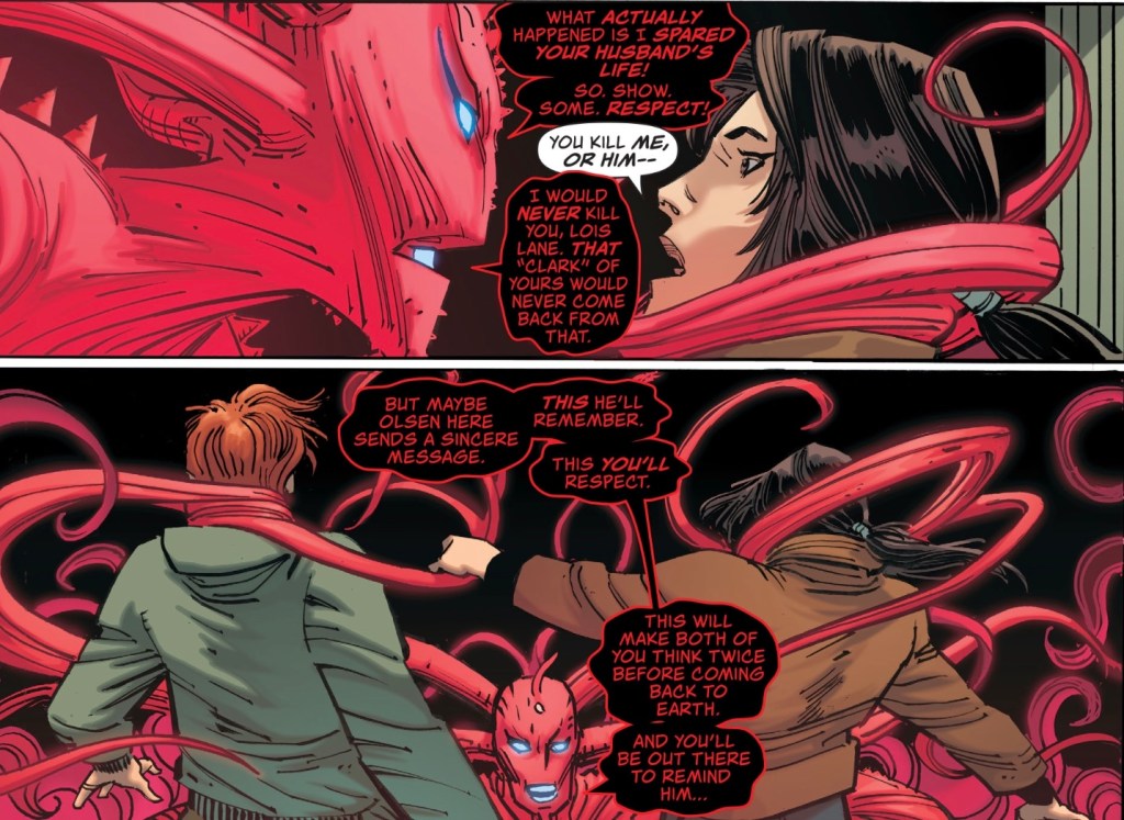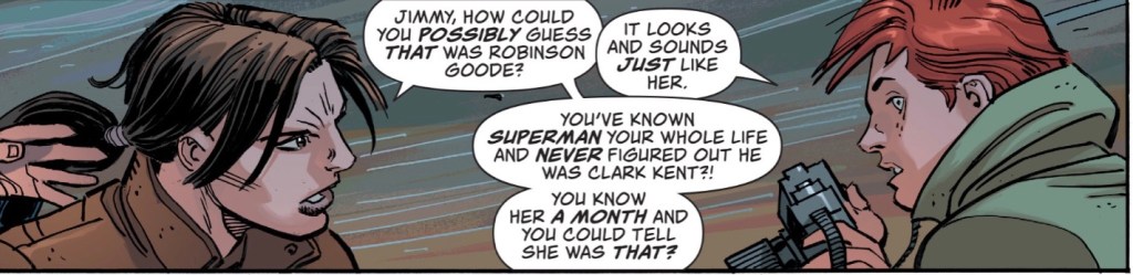 And that, along with Brainiac 5’s tractor moment, is my favourite panel of the issue. Maybe it’s because he’s a photographer that Jimmy looks differently, more likely it was a random Eureka moment… and I don’t buy for a second Jimmy’s subsequent claim that he still doesn’t believe that Clark is Superman, we’ve already seen him deal with that one – he’s just messing Lois around.