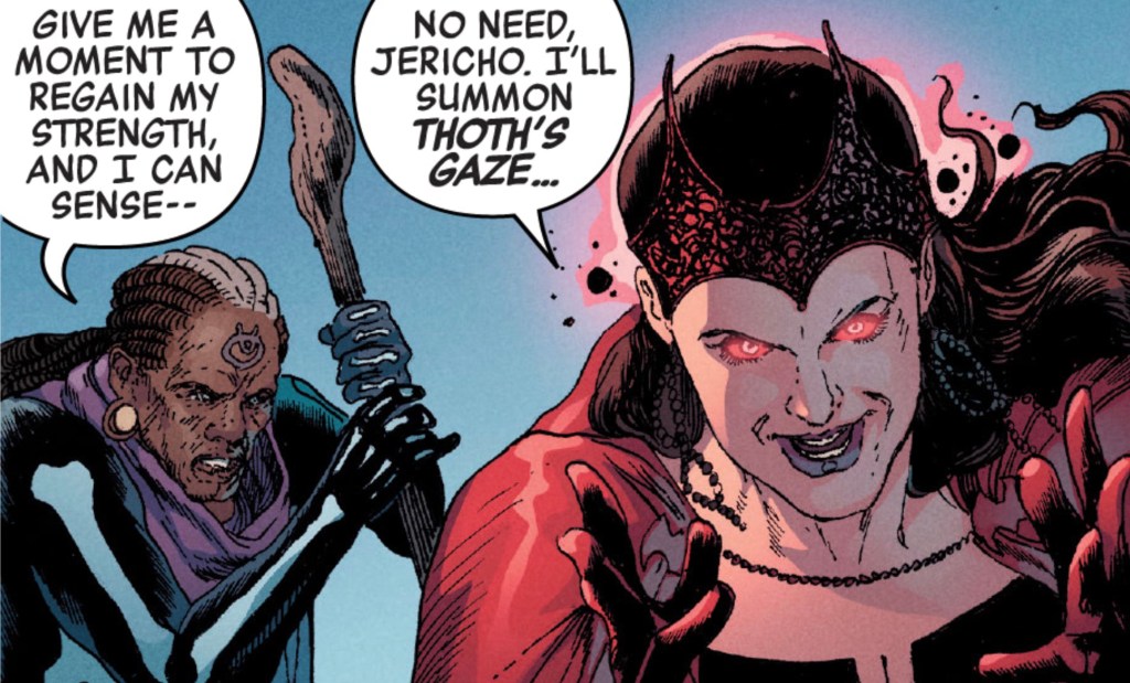 Actually, I can live with that – heck, the whole book looks wonderful courtesy of Carlos Magno (a name which, I’m only now noticing – and this is shameful for an old Arak fan – is basically ‘Charles the Great – rather apt). Magno’s layouts carry the eye across the page and he fills the panels with good looking active, good guys and bad guys. OK, he can’t make that weird new version of Mockingbird’s uniform look good, but I doubt anyone could. It is hideous. And when did Jericho Drum start dressing like a cartoon witch doctor… is that not offensive? It’s a tribute to Magno’s craft and stylish finish that I‘m swept along regardless. Instead, I enjoy the urgency with which he makes Quicksilver run, how he brings off tough perspective shifts like on the opening spread, the serene nuttiness as Wanda casts her hexes.
