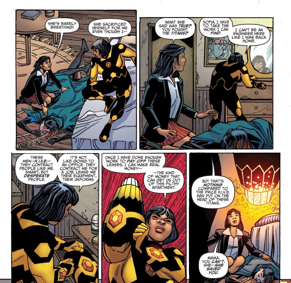 While Raven was singularly uninterested in the demo, she is struck by the pain she feels in the schoolgirl. Following her home, she finds Sofia’s mother – clad in a familiar costume – badly hurt. At great personal cost, Raven manages to mystically heal Mrs Zambrano, whose costume marks her as a member of criminal organisation the HIVE, but desperation trumps gratitude.