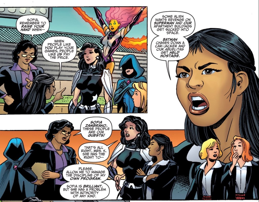 Wonder Girl and Starfire are demonstrating their abilities to a high school science class via the medium of violence. The teacher is talking about the theories behind the powers.