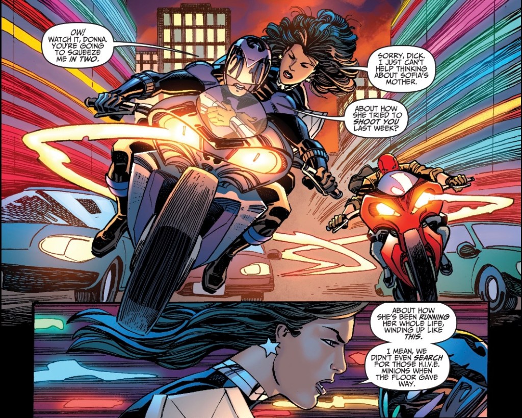 All of which is the start of Career Day, an above average New Teen Titans tale – it’s a packed 16-page parable from writer Phil Hester, artist Scott Koblish, colourist John Kalisz and letterer Marshall Dillon. Hester seems inspired by the earliest Teen Titans stories in that he makes a teenager a big part of the action. Unlike those stories, though, here it’s the parent who’s making terrible choices, and asking the Titans for help is the last thing on Sofia’s mind.