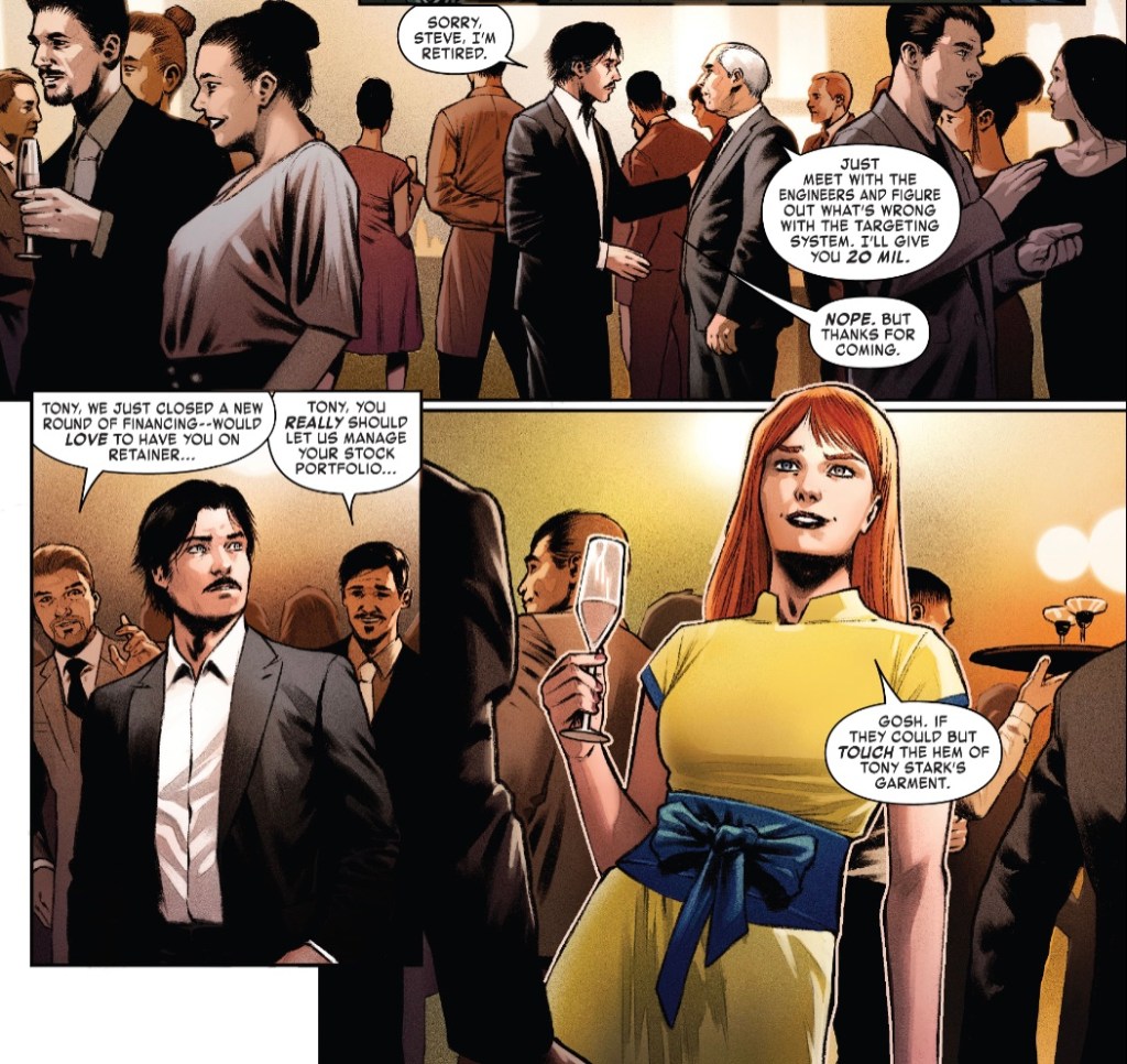 A lot of this issue is Tony holding a party for ‘old friends’, to most of whom he’s a total dickhead. The exception is old Avengers pal Patsy Walker, who dresses like Hellcat even when she’s not out fighting criminals.