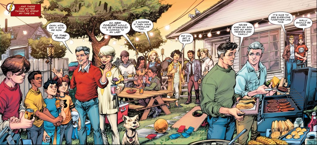 Hi-Fi also handle the interiors, helping each page sing. I particularly like the way the costumes of Flash and Reverse-Flash play off one another, while the barbecue is a delight. Letterer Steve Wands makes Barry’s narrative boxes colourful, yet clear, and I love the thought he puts into the credits page. And kudos to the DC Production Department for their work on that final image – you’ll know why when you see it.