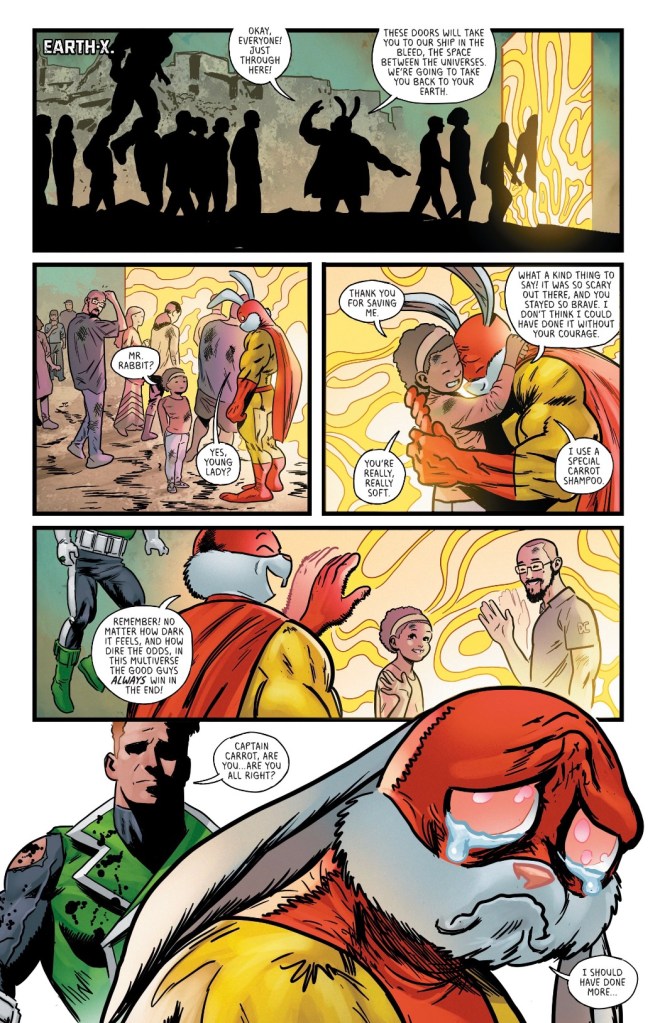 But boy, is he not the hero the people need? That was a Superman-level inspirational speech. And Captain Carrot fights on, helping Guy Gardner, putting his own pain on the backburner, because that’s what heroes do.