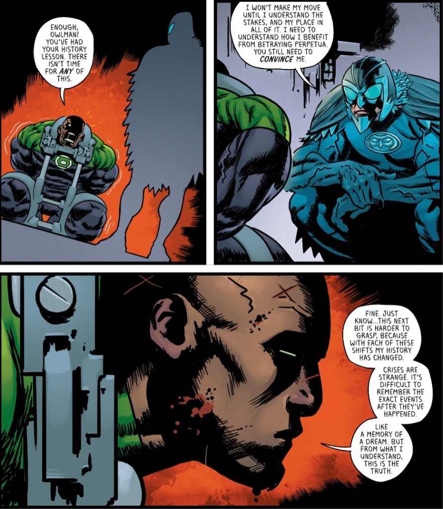 … well, I didn’t hate it. The big bonus is that outside of a symbolic image, there’s no Batman Who Laughs in here. There is Perpetua, the Cosmic Goddess/Whatever who haunted so many issues of the Scott Snyder Justice League run. You know, the one that rambled on for a year and a half about ever more Important Omniversal Dangers that were rarely reflected in the rest of the DC line. The one with the Totality, and Seven Forces and Whatnot. Here’s how Multiverse’s End writer James Tynion IV sums it up, after Green Lantern John Stewart tells his captor, the Owlman of Earth 3, about Perpetua and her world-destroying shenanigans.