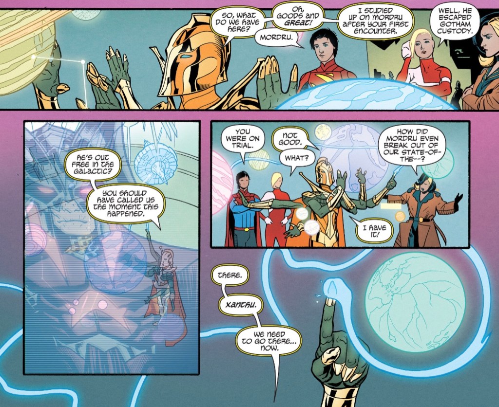 Dr Fate could grab it with six. They’re summoned to Planet Gotham to help Saturn Girl, Superboy and Commissioner Stevenbergen track down rogue sorcerer Mordru the Mad/Terrible/choose your own title.