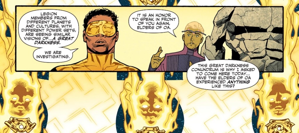 New Krypton really does look idyllic, thanks to the talent of Sook, veteran Legion inker Wade Von Grawbadger and Bellaire. The other worlds are differently memorable, from hot-toned Rimbor, matching the residents’ fiery passions, to light-filled Oa, now home to golden Guardians of the Universe.
