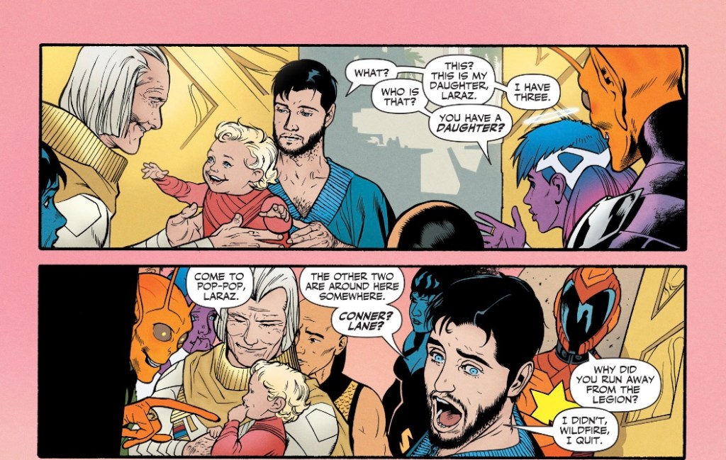 Another surprise. Bendis gave us a similar moment in Young Justice, with Conner Kent apparently a daddy, but that was a feint. This looks like the real thing. The big question is, what happened to the children’s mother? Given Mon-El is dating Shadow Lass, I presume she’s dead or otherwise gone.