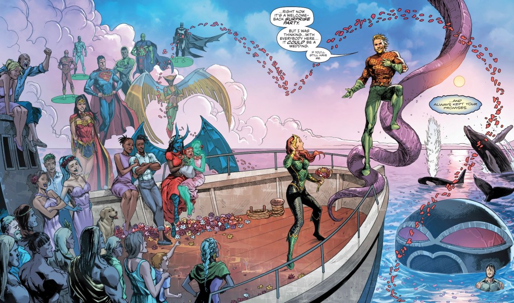 The art by illustrator Miguel Mendonca and colourist Romulo Fajardo Jr is attractive – their Andy is especially adorable, while that big group of Aqua-allies demands a key in the lettercol… what a shame DC don’t actually do lettercols any more. And the wedding scene itself is beautifully composed and coloured. Fajardo’s attention to light sources is excellent, with that first group shot being a fine example. The only page that doesn’t work for me features the figure of Learnaea supposedly dominating the visuals; in truth, she gets lost, blighted by panel positioning.