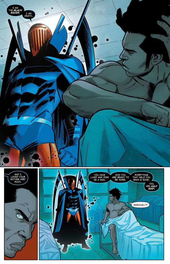 And that’s how the final issue of Suicide Squad starts, with a surprise that works perfectly within the context of the DC Universe. Of course he’s the Black Racer’s kid!