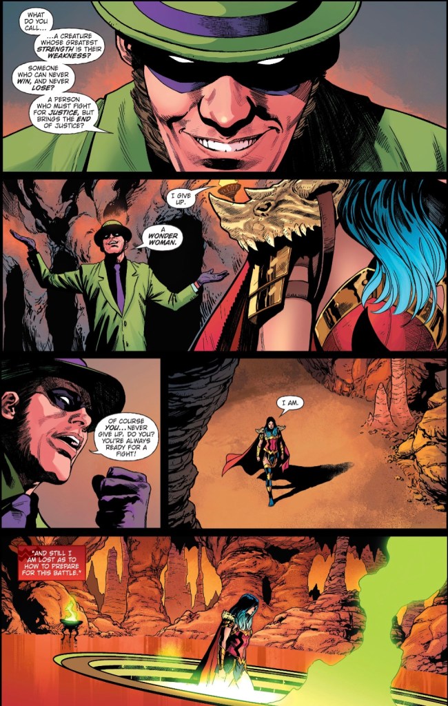 The story is called The Question, so the Riddler scene is apparently important, but I don’t recognise Diana in his riddle. Or understand why Edward Nigma would be trying to mess with Wonder Woman’s head when she’s going to be fighting for his life. I don’t know everything Diana has been through in Death Metal, but I don’t recognise this wet woman. My Wonder Woman is the never-say-die heroine of the Golden Age and the pre-Flashpoint years.