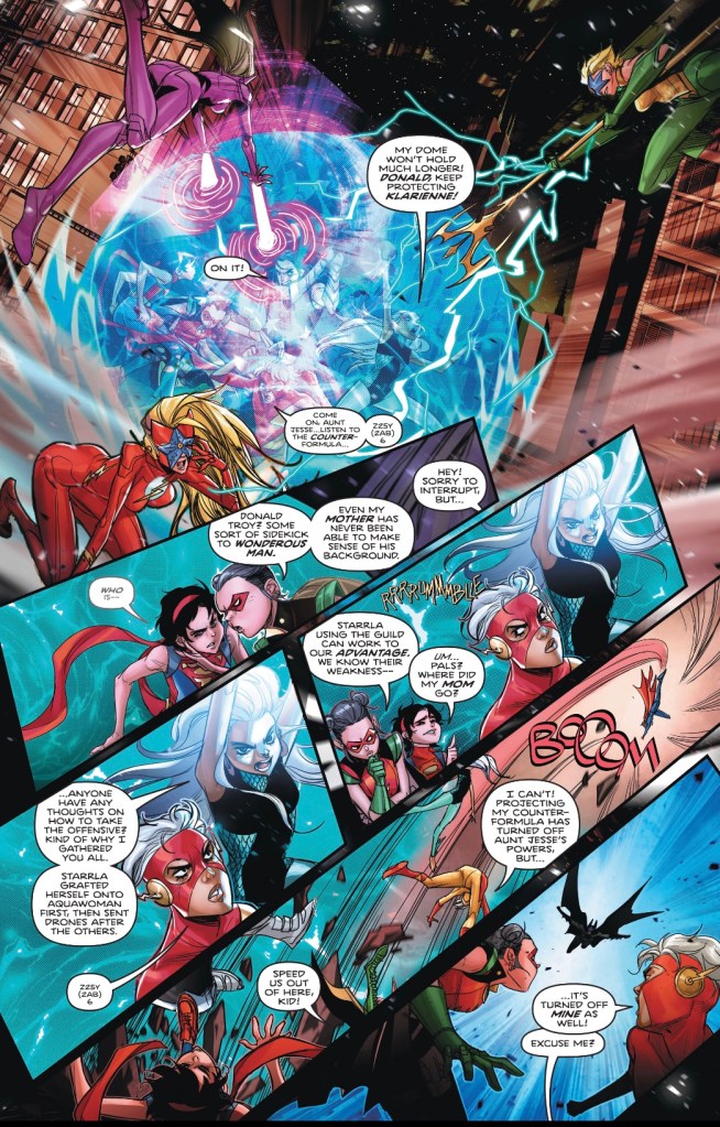 Earth 11 is the gender-swapped planet, and where we meet, for the first time, Klarienne the Witch Girl, Supergirl (Laurel Kent), Robin (Talia Kane), Kid Quick (Jess Chambers), Aquagirl (Jacqui Hyde) and… Donald Troy. Honestly, a Donald Troy gag alone pretty much justifies this eight-page diversion from writer Ivan Cohen and artist Eleonora Carlini, but it’s also full of fun character moments, dynamic layouts and characterisation, and a terrific take on Zatara.