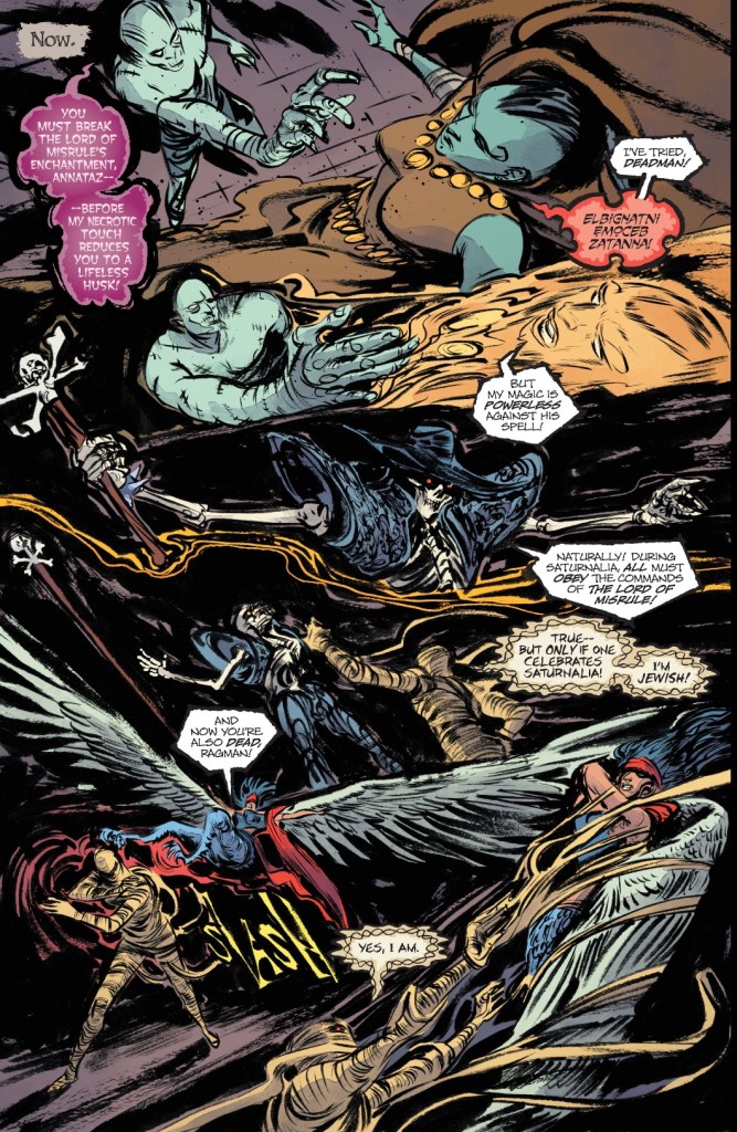 On unlucky Earth-13, the League of Shadows – Annataz, Superdemon, Hellblazer, Fate, Swamp Man, Witchboy, Deadman, Enchantress and Ragman must save Saturnalia. Again – Mother Destruction and the Lord of Misrule seem to make a habit of threatening it. Writer Sholly Fisch gives us a second story strand, the origin of one of the heroes, in a far distant land and time. He also spins some of the most impressively elaborate Etrigan rhymes ever, in a tale of action and atonement. The splendidly intense scratchy art comes from Vanessa del Rey, with colours by Tamra Bonvillain, while letterer Ferran Delgado has enormous fun with fonts – wait until you see Witchboy’s spellcasting.