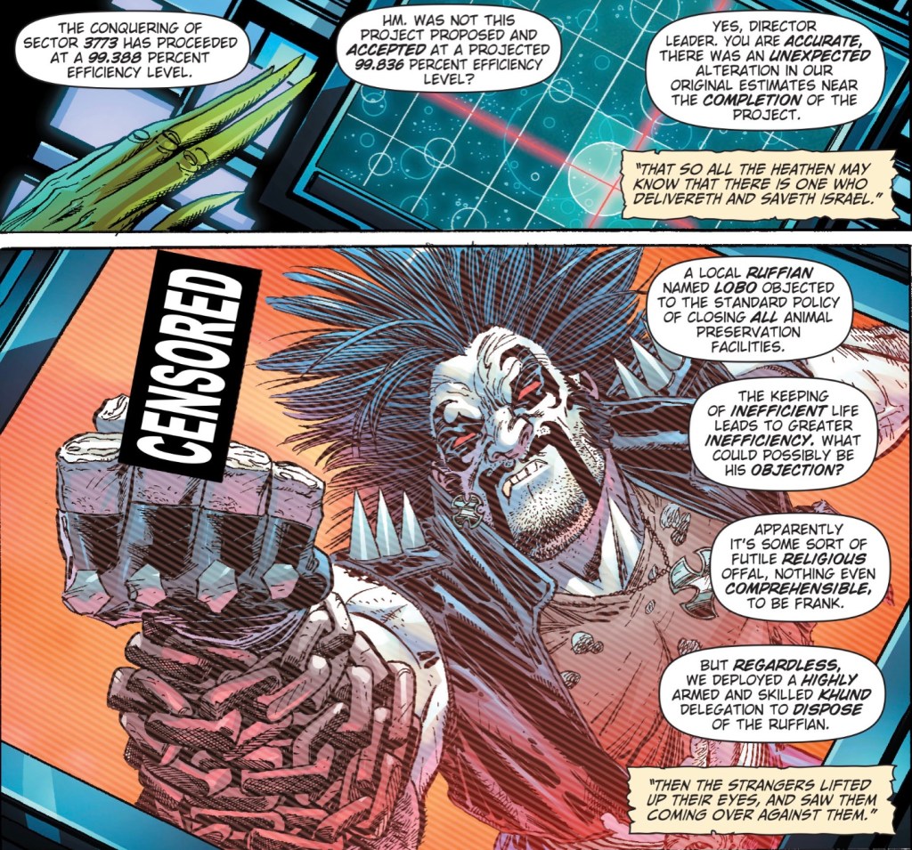 I’d like to apologise to letterer Rob Steen – halfway through the final story, A Very Lobo Hanukkah, I stopped looking at most of his nicely rendered work. Thing is, it’s writer Tom King in quote mode yet again – we’ve had poems in Heroes in Crisis, songs in Batman… and it’s a device that never works for me – just give me your words, Mr Writer, if I wanted to read the other stuff I’d be reading it. A good comic story is enough, I don’t need earlier works to add extra texture or import or whatever the point is meant to be. I tried, I really tried, to appreciate how passages from the biblical book of the Maccabees inform this story of Lobo fighting back an invasion by the Dominators to defend – what else? – space dolphins. It’s terribly tiresome, so I stuck with the dialogue, enjoyed the art by Scott Koblish and wished this wasn’t the final story in what’s generally a very fun comic.