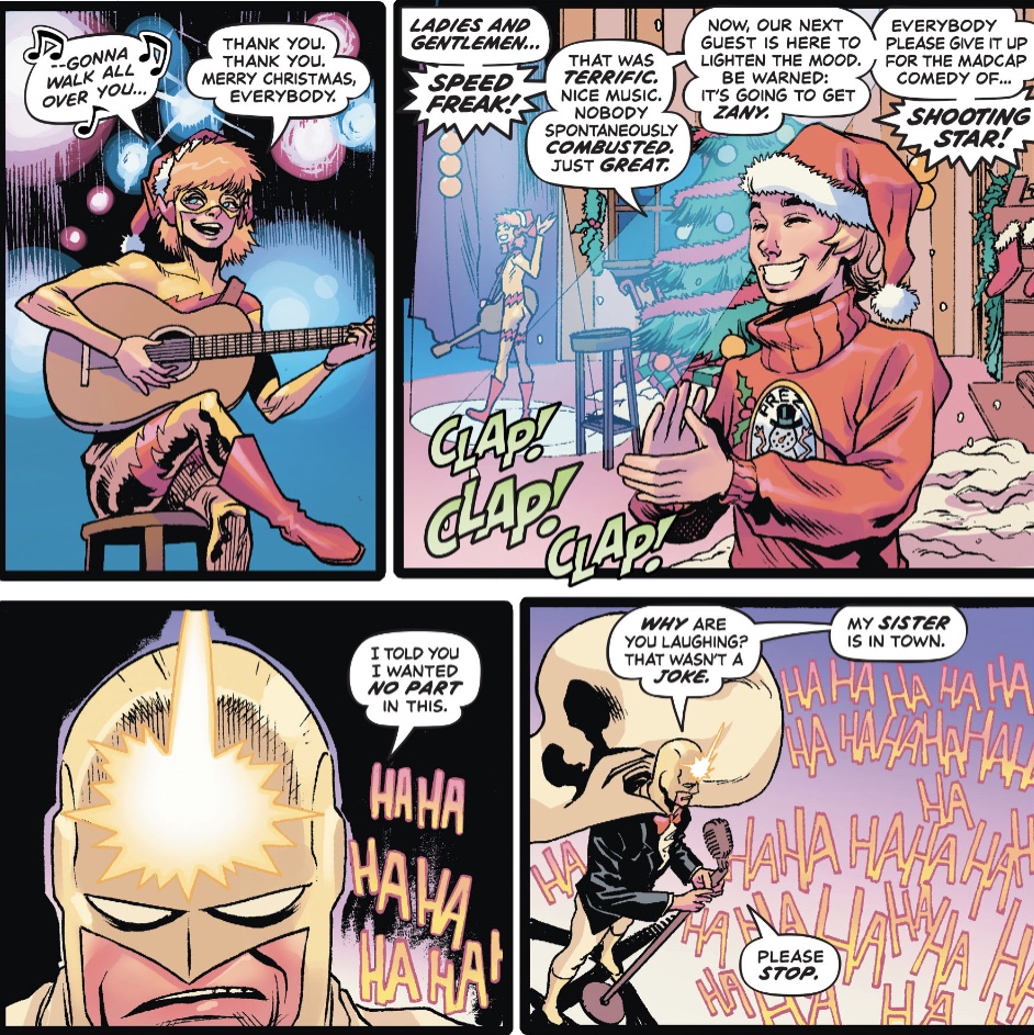 It’s showtime on Earth 47, where members of the Love Syndicate of Dreamworld headline Prez Rickard’s Magical Sci-Fi Desolate Souls’ Club Holiday Special. It’s a lot of throwaway gags courtesy of writer Jay Baruschel and artist Dominike Stanton, but most land – anyone who can explain Pandar the Fallen and the Captain Carrot gag, please do.