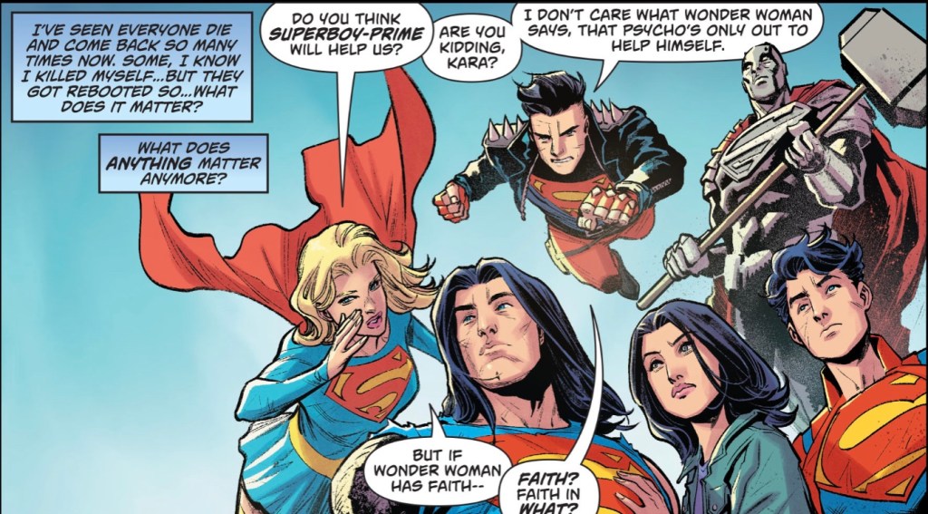 Of course, this being a Death Metal book, there’s lots of punching and blasting, but refreshingly, for a comic starring Superboy Prime, no bloody murder, not even a head or arm removed.