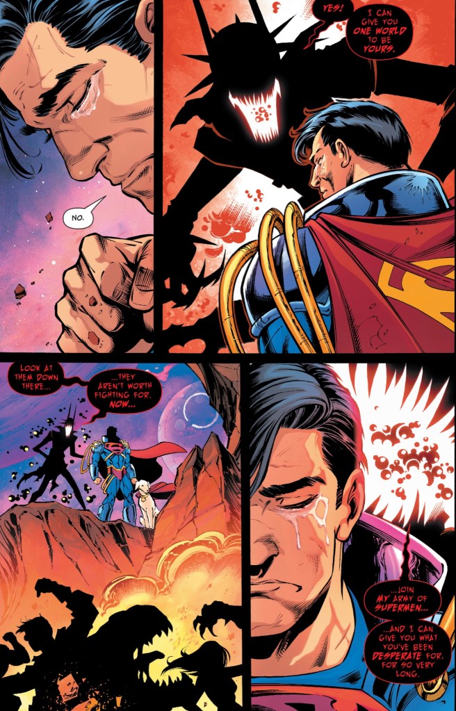 The twisted, cosmic-powered evil Batman can’t see Superboy Prime going through with his plan. In fact, he tries to recruit him.