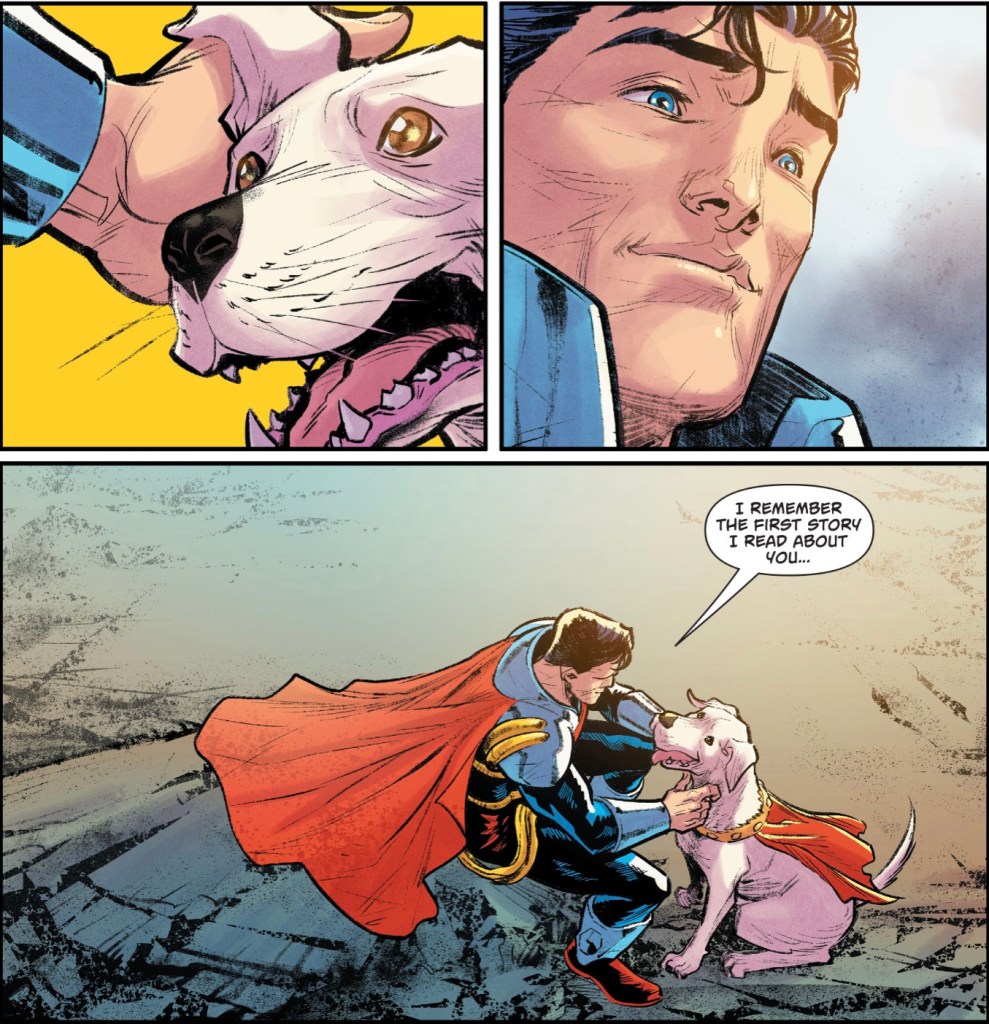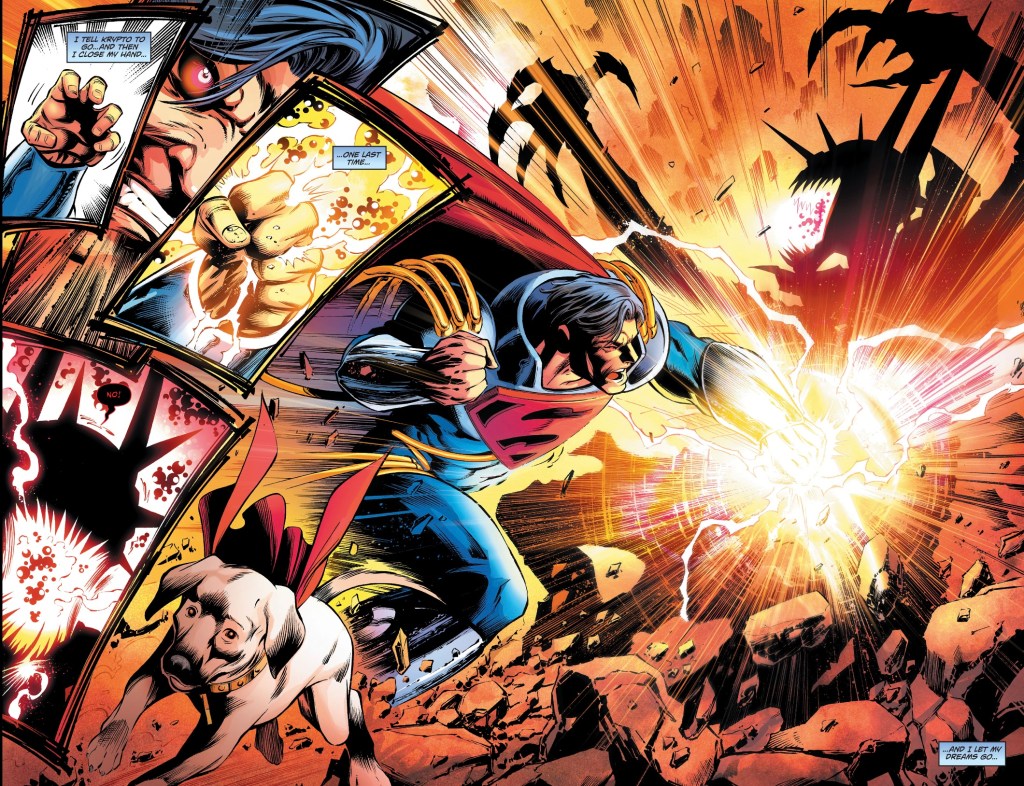 Krypto the Superdog. This is the point in a Superboy Prime story in which he shows how psychotic he is by frying a good guy. Poor Krypto….