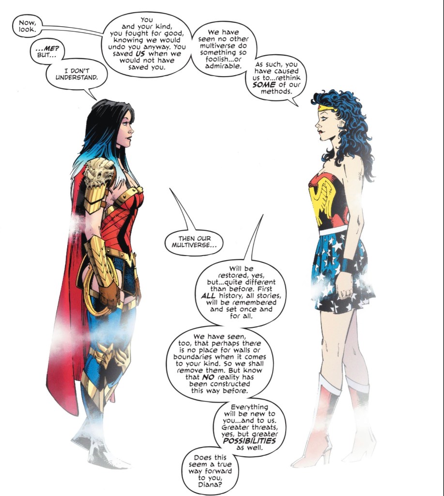 It seems that recreating creation is OK if the galactic god doing it is a fan who’s into Golden Age cosplay. But there’s a price. Wonder Woman must agree to forego her place in the new reality and watch over it from afar. Which means she misses the big party back on the reborn Earth.