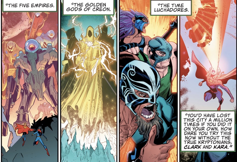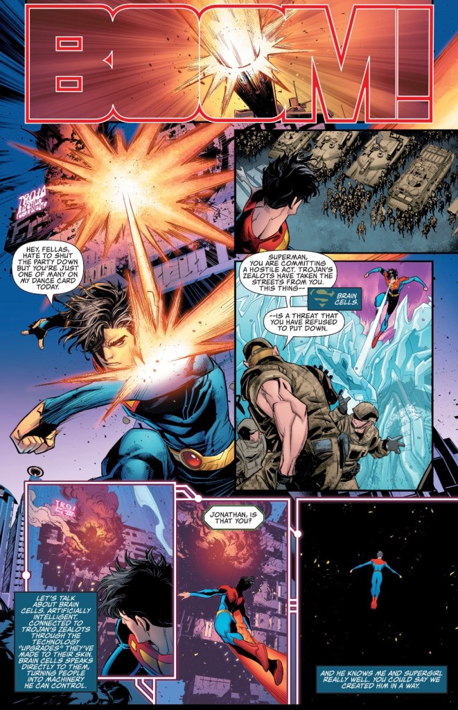 I’m also unconvinced by Jon’s confidence problem, as pointed out by Brain Cells and his own inner thoughts. He has/had (no info about the fate of Lois here either, though solicitations put her in a very strange place) parents who adored him, a great pal in Damian and is remembered a millennia in the future. Why does he believe people are expecting him to fail?