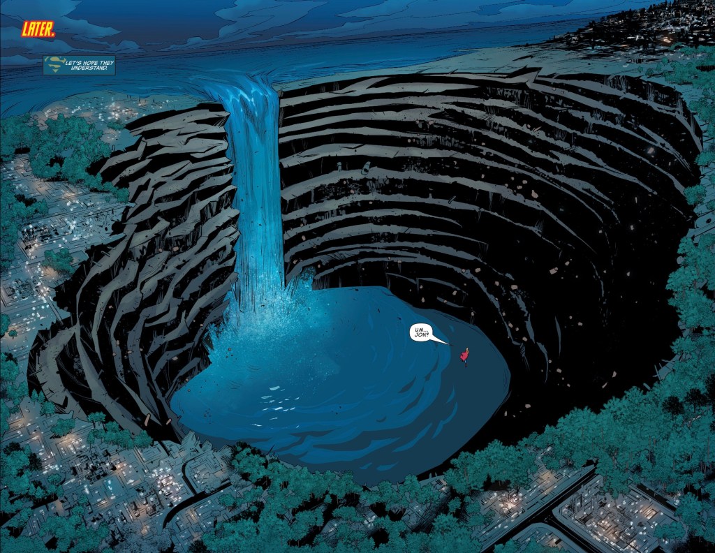 The art by John Timms is as nice as I’ve come to expect from his Young Justice work, with only the cover image of Jon striking me as off – there’s something weird about the torso, its length, I think. I’m not usually one for spreads without much going on, but the double-page look at the spot where Metropolis was is rather great, with the sea just dropping into the canyon, instead of forming a river – that’s a nice piece of thinking.