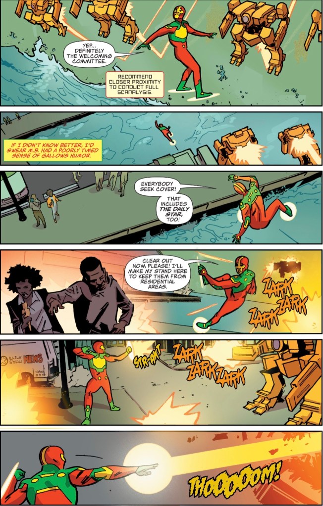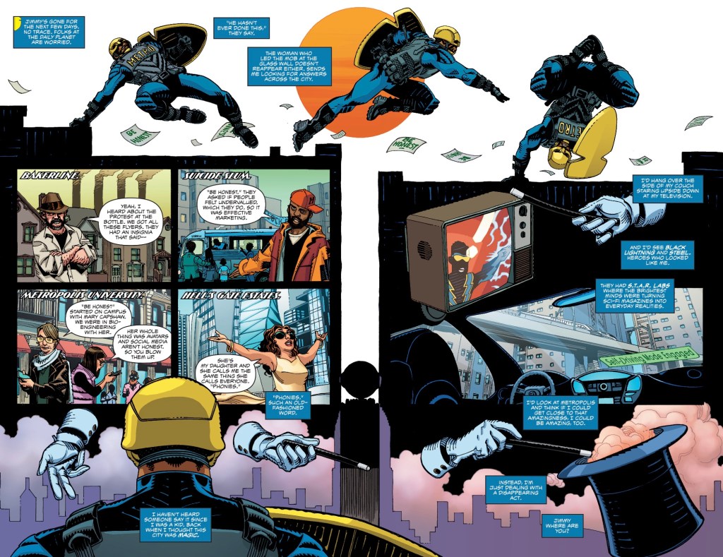 The Mr Miracle story starts with the people of Metropolis looking up at the shiny glass bottle surface as a TV news team reports on the ‘mysterious barrier’ that’s constraining them. See, Jon, they’re not stupid! Shiloh analyses the barrier, some mechanical droids attack, he shows off his skills. Our young Mr Miracle – sporting a terrible new costume – understandably assumes the bad guys are created by whoever erected the barrier, but readers know different. This isn’t a badly crafted piece from writer Brandon Easton, illustrator Valentine de Landro and colourist Marissa Louise, but if I’m paying for a back-up in a Superman Family book, I want a Superman Family character.