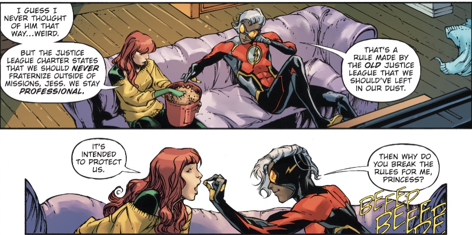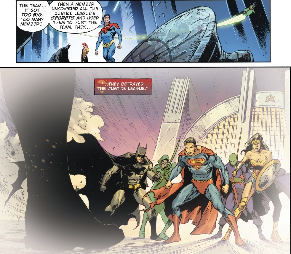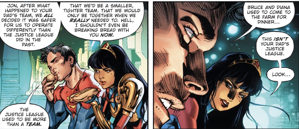 Writer Josh Williamson lays out the characters and backgrounds with economy and precision, giving us enough to get into the story without preempting information to be revealed in other titles. Having survived the car crash that was the Wonder Woman/Superman romance of the New 52, I’m happy there’s no obvious thing between Jon Kent and Yara Flor, with hints of love left to the Andy Curry/Please, No Pronouns Flash. Green Lantern is Jo Mullein, someone I know little about; she seems tetchy and to have packed in her commitment to the Far Sector, which is supposedly as distant from Earth as it gets. The Caped Crusader must be Call Me Jace from the Next Batman book, who seems kinder than contemporary versions of Bruce Wayne.