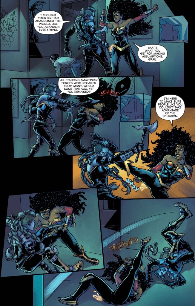 Penciller Alitha Martinez and inker Mark Morales do an excellent job of showing that Nubia’s fighting style is different to Diana’s, it’s a lot more hands on. I’m not convinced Nubia’s enormous hair is the most practical, but I’m not getting between a woman and her style choices…