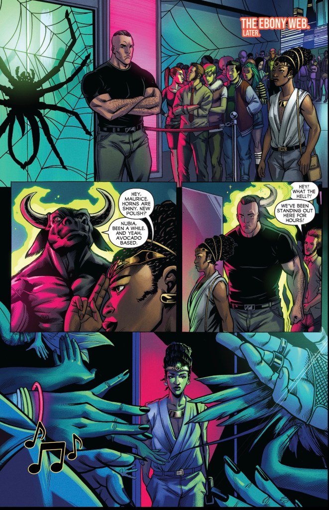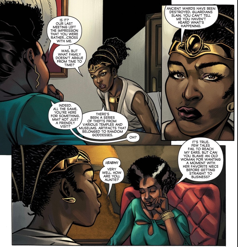 Auntie Nancy, Ebony Web… I guess Nubia’s relative is the always knowledgeable spider god Anansi. And her chat with Nubia teases an interesting history, one I’d like to know more about.