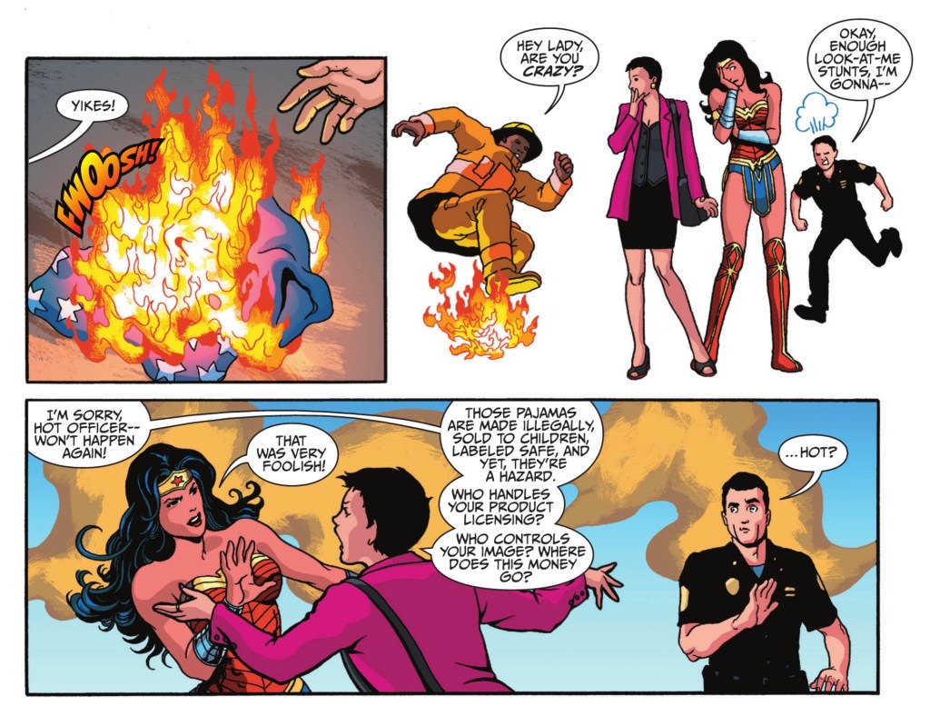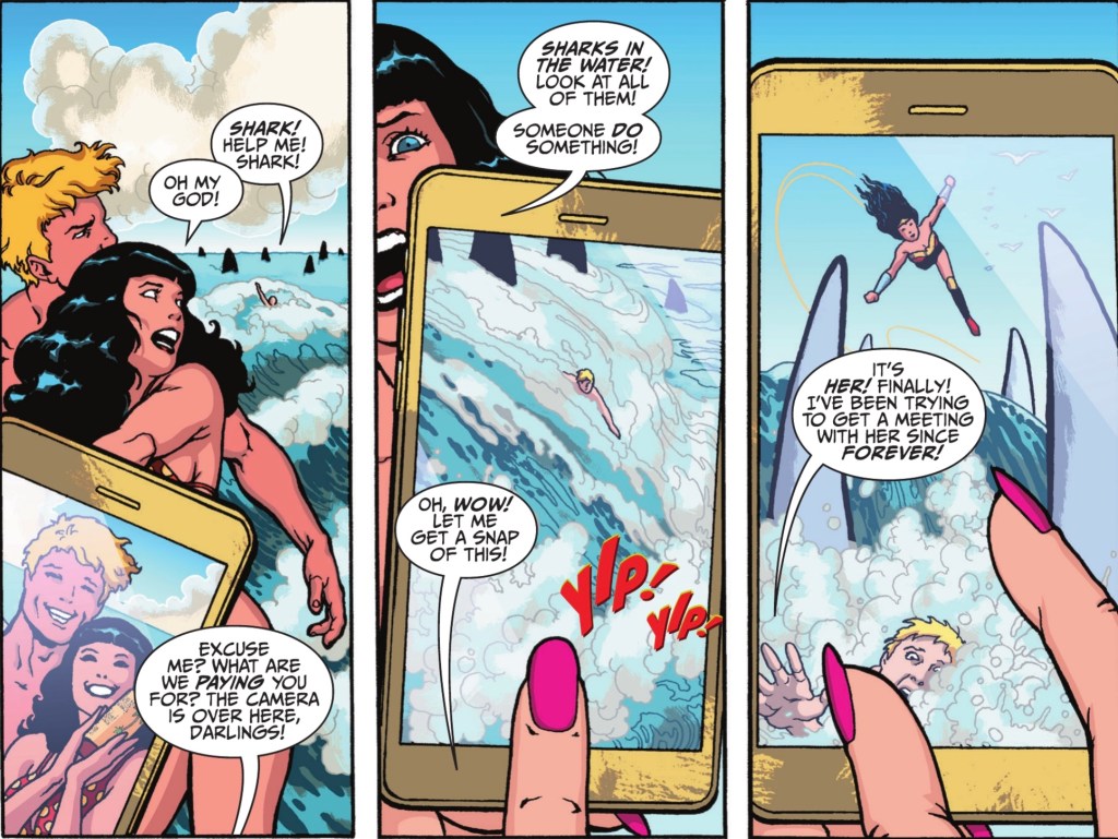 The lady living life through the lens is thrilled that Wonder Woman is right there, before her. She’s been dying to get a meeting with the Amazing Amazon because where there’s a celebrity, there’s money to be made. Diana doesn’t care about cash, but the stranger has another way to get her attention, when she catches up with her at the scene of a second emergency.