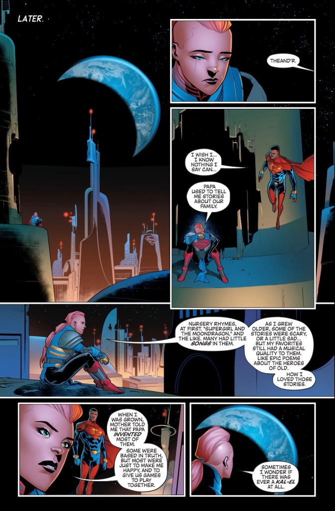 Phillip Kennedy Johnson’s story adds to the impression, being mainly a parade of characters in explosive moments. We don’t get any background on the moon community – presumably the settlement from the terrible Kara Zor-El, Superwoman book several centuries on. But how does it work, does anyone apart from super-people live here, or is it simply an Els-World?