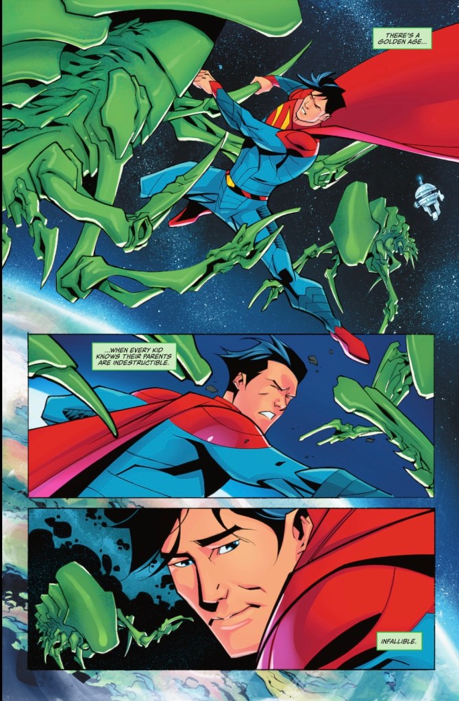 Beyond Earth’s atmosphere, Superman and Superboy are defending the earth from space shrimps.