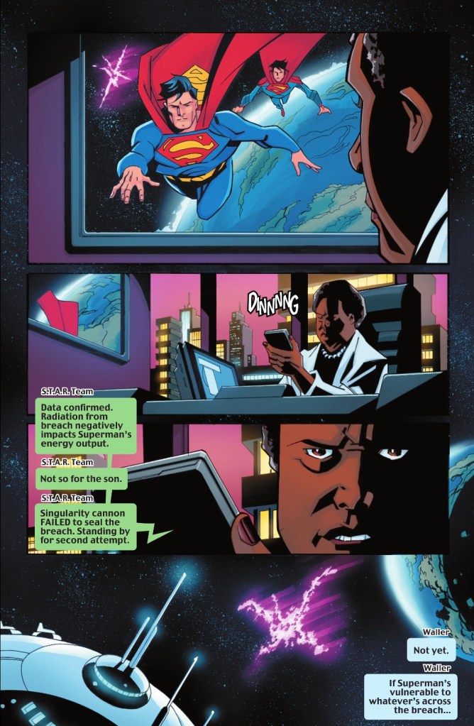 First up, I don’t think Waller was really written out of character here. She’s letting the breach stay open a little longer to get more data, but that doesn’t seem eeeevil to me — just ruthless and pragmatic. She doesn’t seem to think she’s putting anyone in danger since Superman and Superboy on the case. And her wanting information that could be used against Superman seems entirely in character for her, in whatever era.