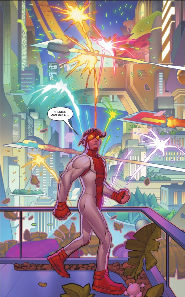 This is a 38pp story, meaning there’s plenty of room for Jurassic japery, and it’s a joy. Our hero’s attitude is ‘As scary as this is, you’re going to miss this one day, Wally West’ and he’s right. How many people get to experience something like this? I’ve long wanted DC creators to embraced them ‘go anywhere, do anything’ possibilities of the multiverse and it seems Adams – who wrote the exceptional Black Adam story in Future State Suicide Squad – agrees.
