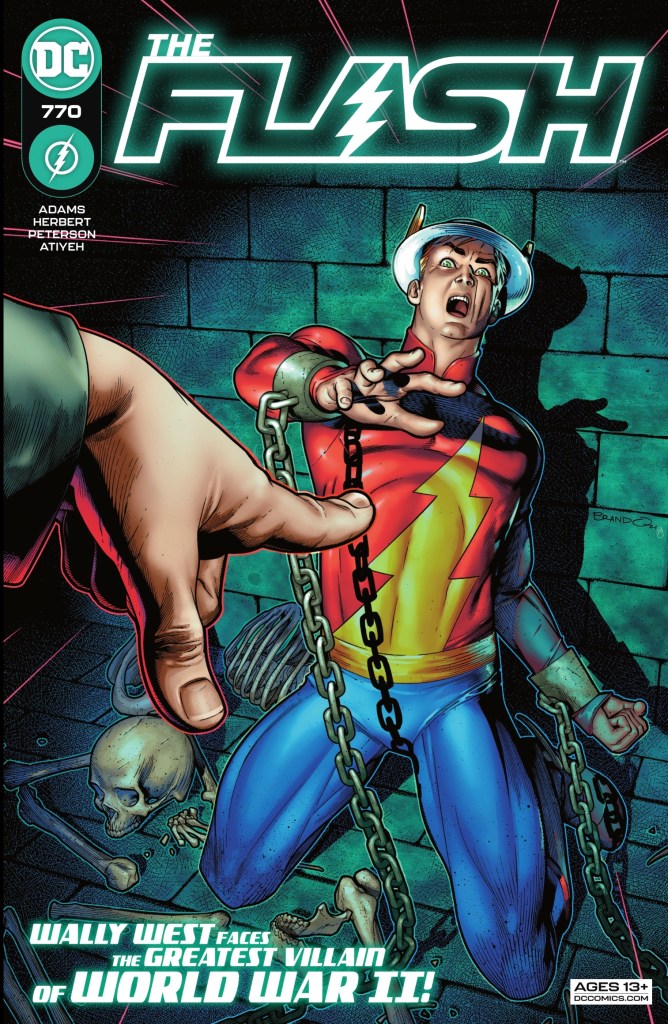 Well, ‘form’ isn’t quite right… Wally’s currently a dimension-hopping spirit, jumping from speedster to speedster on a mission to save the Speed Force. He doesn’t know if he’ll ever get home, but Wally’s priority is to stop a stray burst of super-speed from exploding, as the cover quite fairly puts it, ‘the greatest villain of World War II’.