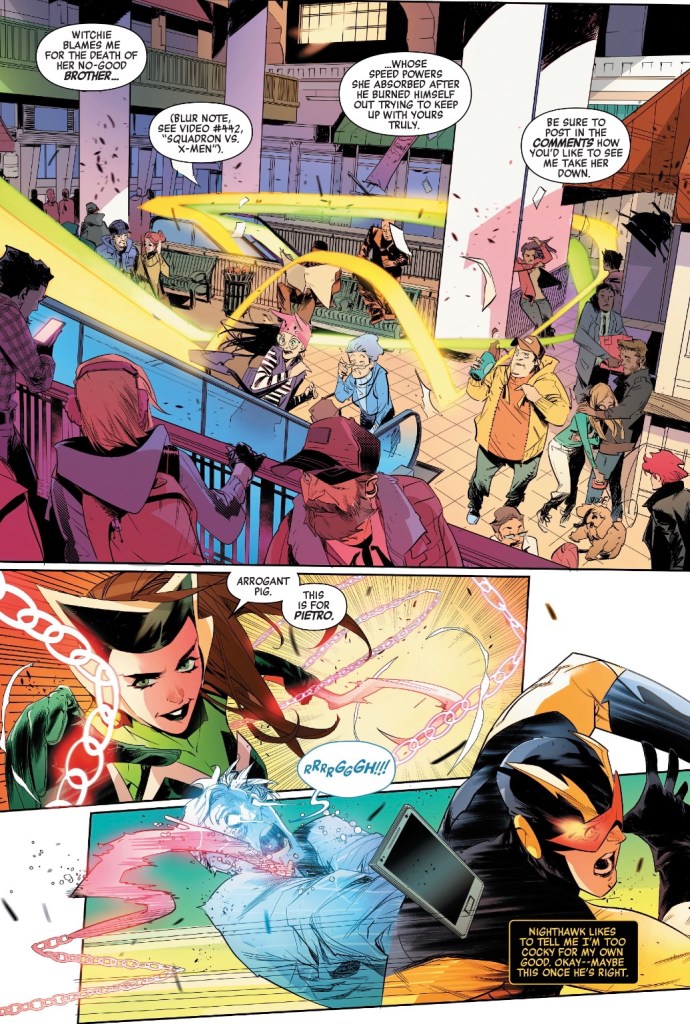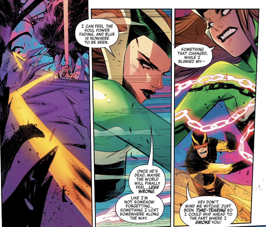 With so many speedsters in comics, it’s tough to find a new angle, but writer Jason Aaron makes Stanley different, even without the magic angle. Years ago, Peter David surprised readers with a fascinating presentation of Pietro Maximoff as the most impatient, bored – and probably talented – man on the planet. There’s an echo of that here, with Blur doing dozens of things at once, but the novelty factor comes with the way he sees time.