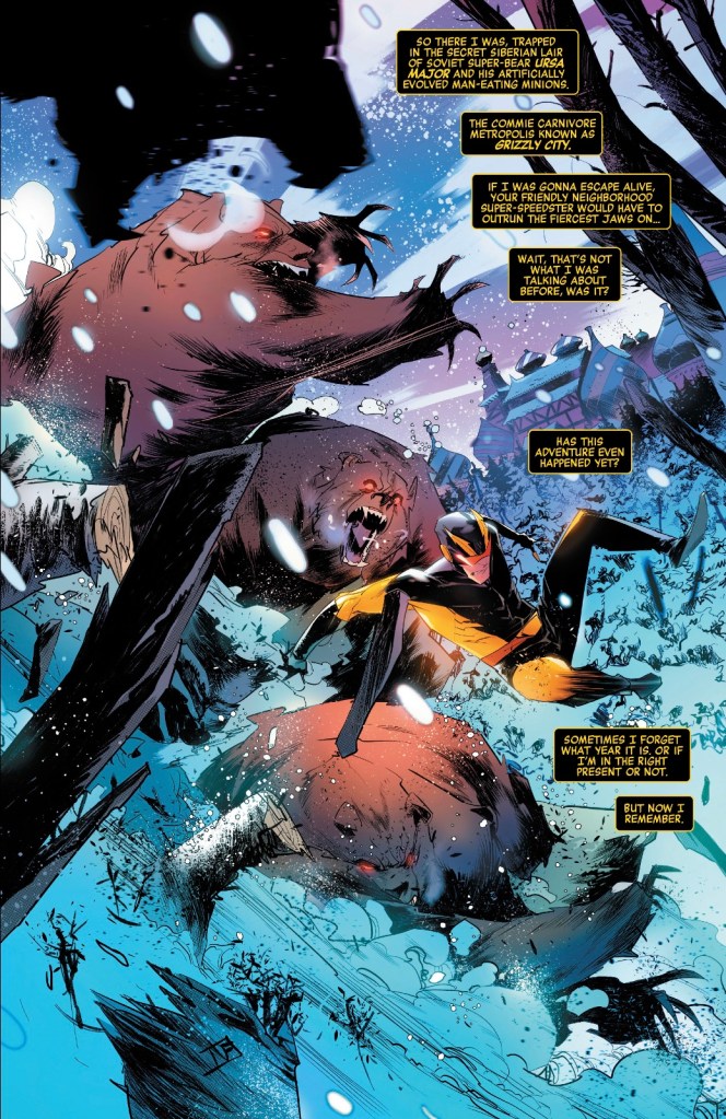 I’d love it were some of the ideas in these comics to survive the return to regular reality, such as Grizzly City, certainly a nod to The Flash’s Gorilla City. And I like Silver Witch (yes, she’s in Quicksilver green, but the 616 Scarlet Witch originally sported that colour), she reminds me of the legacy character I imagined back when Barry Allen was dating Zatanna, a kid codenamed Unstoppable, running around the world tossing out spells at speed.