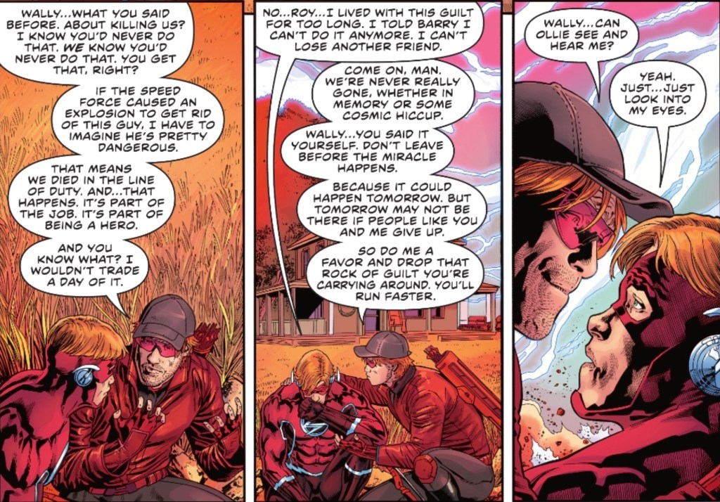 Roy Harper, Speedy, one of his oldest and best friends. And one of the heroes at superhero rehab clinic Sanctuary apparently killed by a surge of Speed Force energy that burst from Wally in a moment of extreme stress.