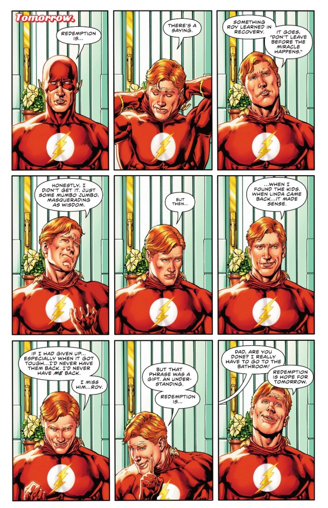The best thing about this page is that its style, the straight-to-‘camera’ nine-panel grid format, puts us in no doubt that Adams is commenting on Heroes in Crisis. And that comment is that there’s no room for despair with this Flash; gone is Tom King’s pessimistic worldview, with a Sad Sack speedster rejecting Hope. Instead it’s Wally quietly reclaiming the idea, via his friendship with Roy.