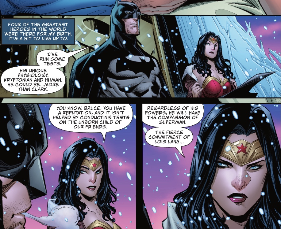 Gosh, one of the last people I’d want to see as I’m giving birth to a child is Wonder Woman. What would she know about it? And why the heck is Lois wearing THAT during such a time? Also anyone with any sense at all would BAN BAN BAN Bats from being anywhere near the event. Why isn’t Wondie helping with the invasion? Has she lost her powers again? Does this world not have obstetricians? Specialized OB/GYNs who have been working on the unusual case since before fertilization? Why is WW insisting on making a call about this baby being the most important etc etc blah? Why is she being put in the prophet’s role of announcing the birth of a messiah? And it’s so PC that people keep bringing up Lois’ strengths by separating the two Kent characters’ traits along such hard lines. Why not just say, “Lois, you and Clark are wonderful people. Your child will be wonderful as well”? Rolling eyes.