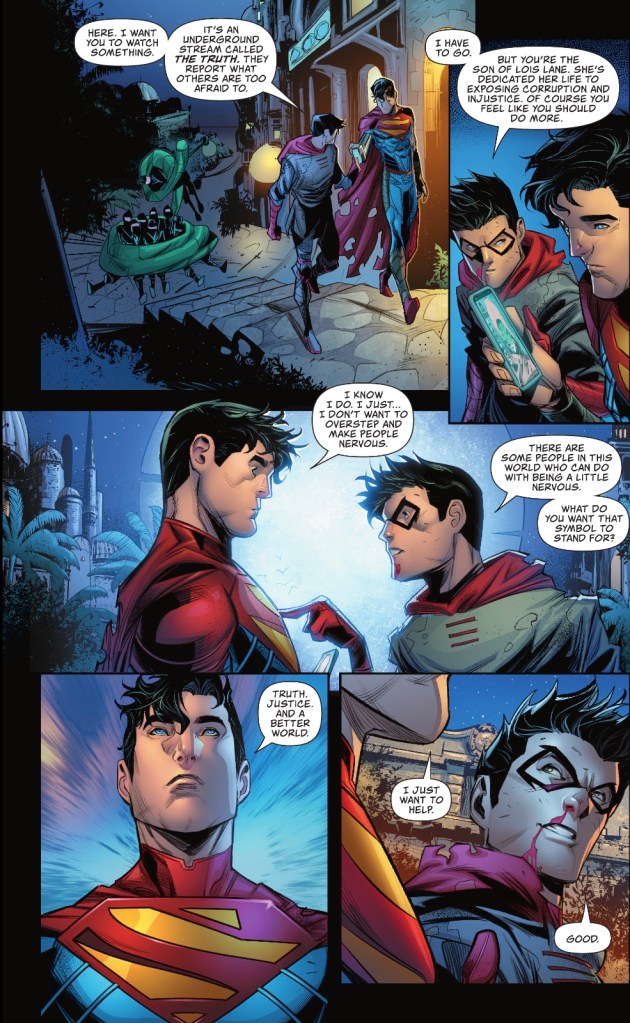 Disturbed by the soldier’s actions, the new Superman seeks out his best pal, Damian Wayne. Of late, the youngest Robin has been occupied with a contest of martial artists, but he’s good for a talk.