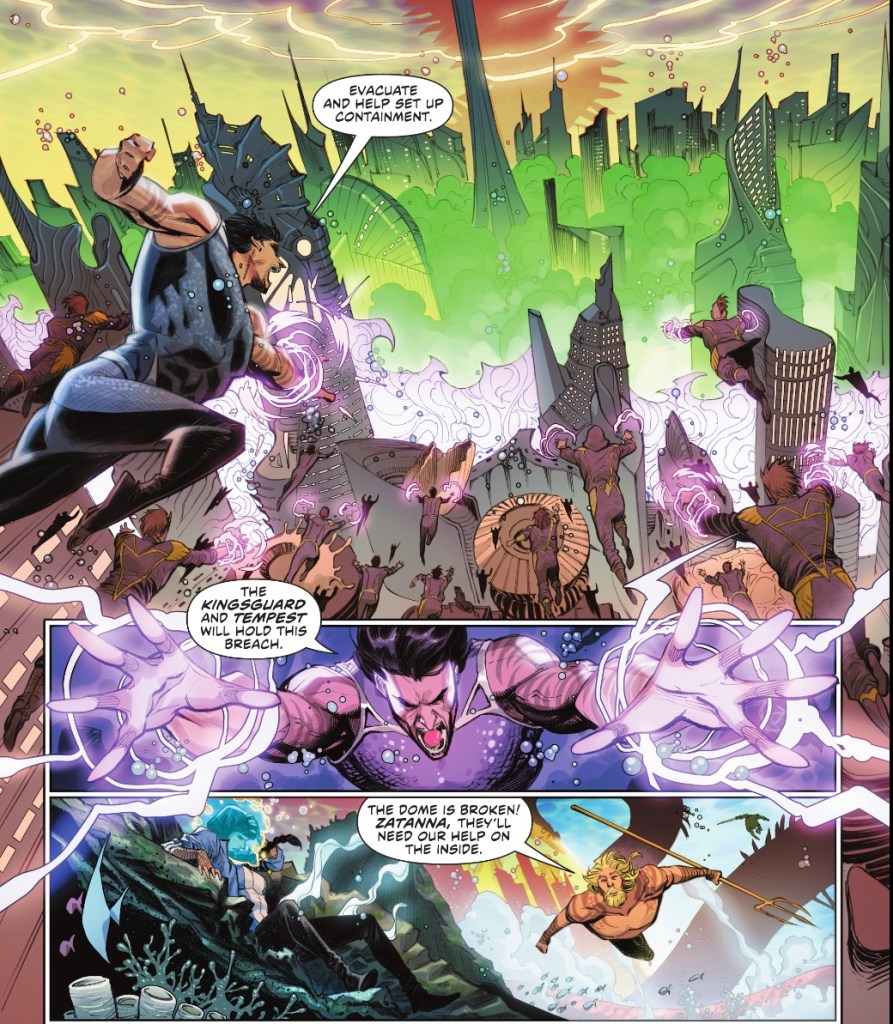 We then see where Merlin, no longer the friendly mentor of Etrigan, is… Atlantis, battling members of Justice League Dark. And they have help.
