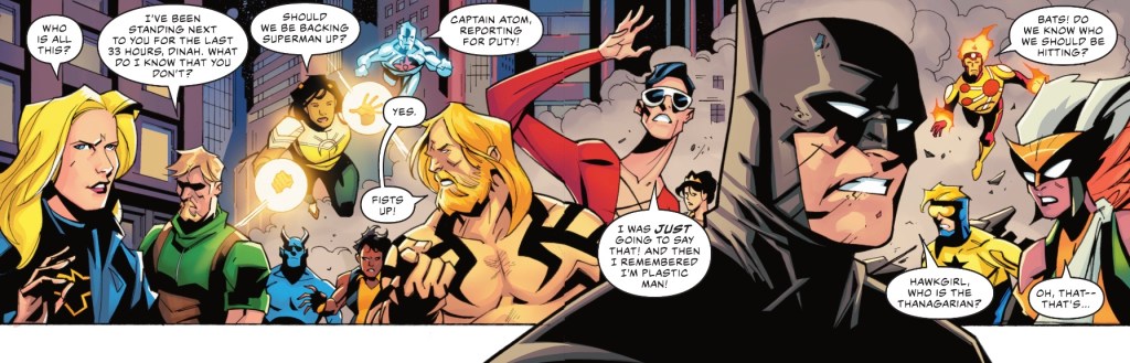 The main storyline involves deeply dull Superman villain The Synmar Utopica smashing League HQ the Hall of Justice because he wants to upset Superman or take over Earth or… something. The B story with Leonardo (either Lois’ just-popped-into-existence twin, or a visitor from that gender-flipped Earth) belongs in another book, Checkmate, but after a recent publishing announcement it seems clear it’s setting up the coming Deathstroke Inc series in which longtime Leaguer Black Canary will co-star.